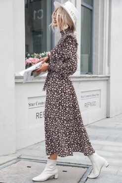 Les manches bouffantes et le col montant froncé sont les touches finales qui font de cette robe un choix incontournable pour celles qui recherchent une tenue à la fois chic et féminine. Chaque élément contribue à créer une tenue romantique empreinte d'élégance et de féminité.